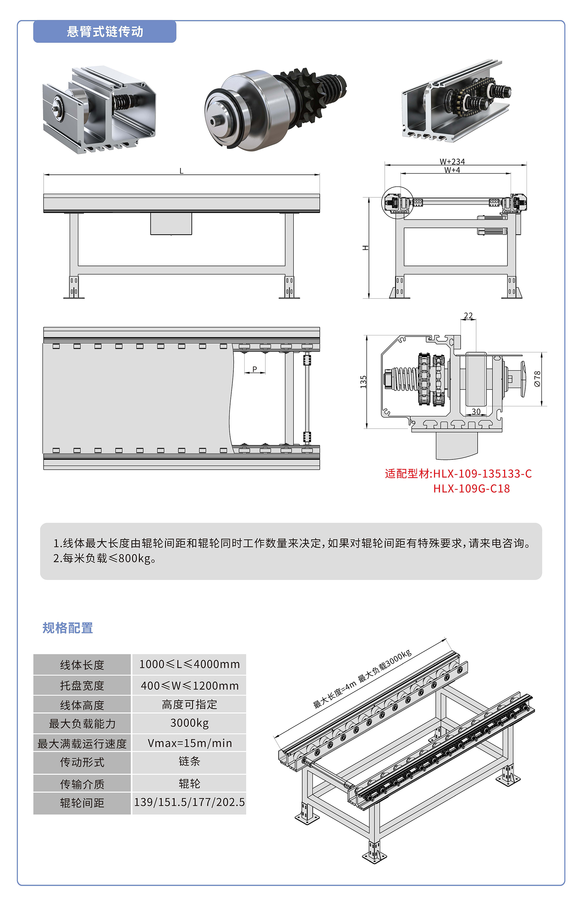 采用135133鋁型材,鏈輪傳動,鍍鉻滾輪鑲嵌銅套實現積放功能,負載3000kg/米,最大負載速度15M/min, 輪距139、151.5、177、202.5可選,適用托盤寬度400-1200mm,線體長度范圍1000-4000mm, 高度根據需求定制.