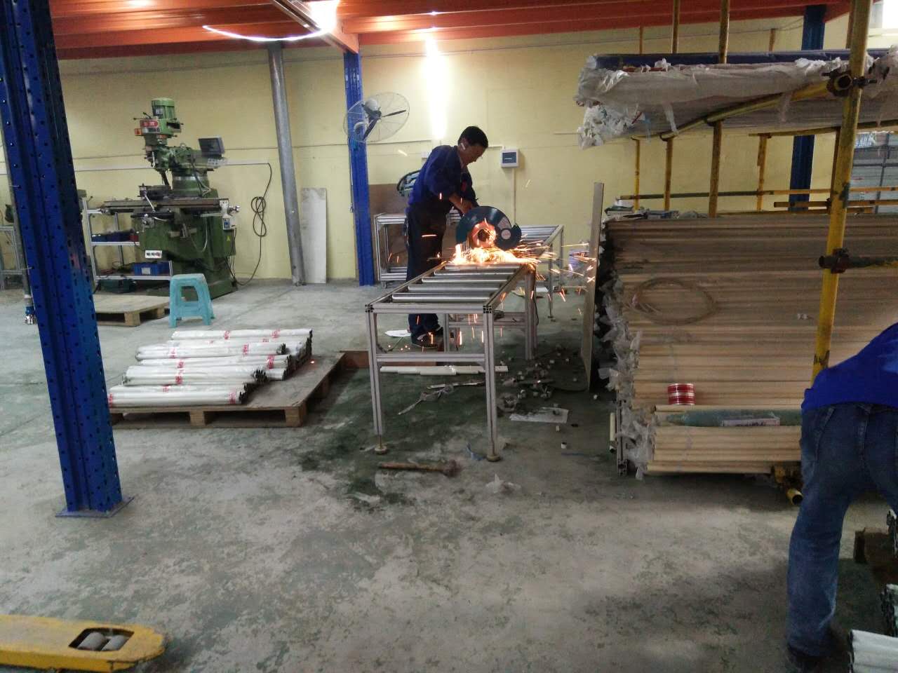 匯利興人正在切割精益管  匯利興人認真的對精益管或鋁型材進行鉆銑、切割 匯利興精益管小知識:材料(外部塑料層+中間鐵管+內部防銹涂層)、外徑(27.8mm-27mm)、內徑(19.5mm-24mm)、鋼管壁厚(0.8-1.5mm)、顏色(米黃、米白、純白、黑色防靜電、藍色)。