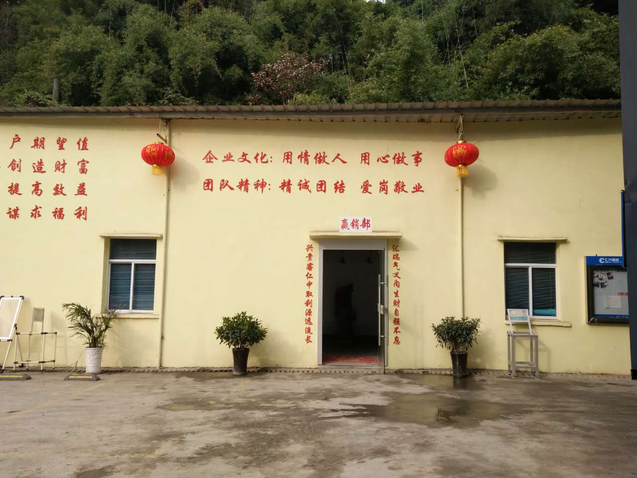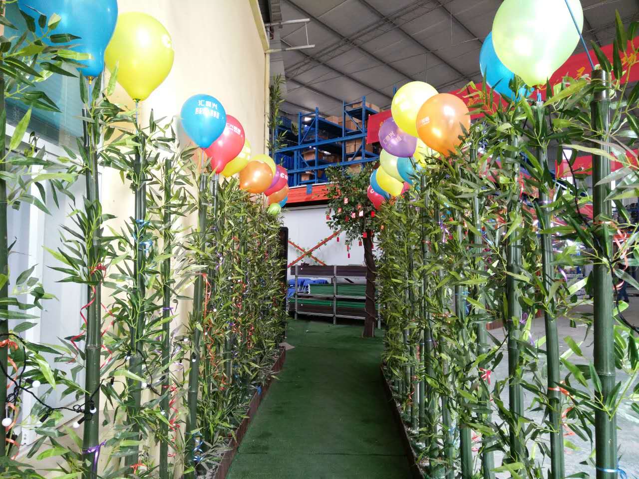 張燈結彩,彩旗飄飄-好山好水好地方好彩頭 陽光普灑在匯利興墻面上紅彤彤的燈籠兒掛立兩旁彰顯著匯利興紅火的前方,進而也突顯著匯利興企業文化與團隊精神同時也在溫暖著匯利興人的心 精神抖擻的匯利興人在認真的工作 綠草青竹有著無顏六色的彩帶與氣球兒的點綴成為了一顆璀璨耀眼的明珠,一個“世外竹源”。