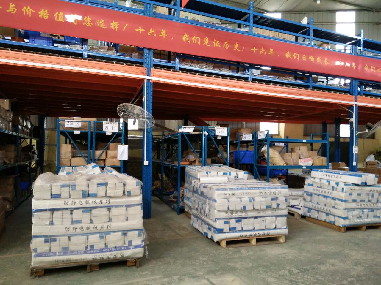 匯利興配件專區(qū)一角,防靜電膠皮整齊擺放于鏡頭前,海量庫存量、上千種配件系列全集聚于此;精益管、流利條、工作臺板、各式滾筒等盡在匯利興。