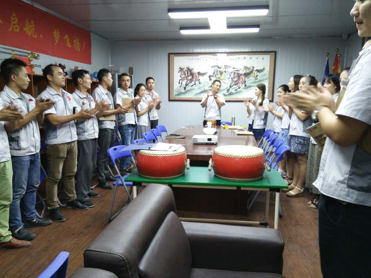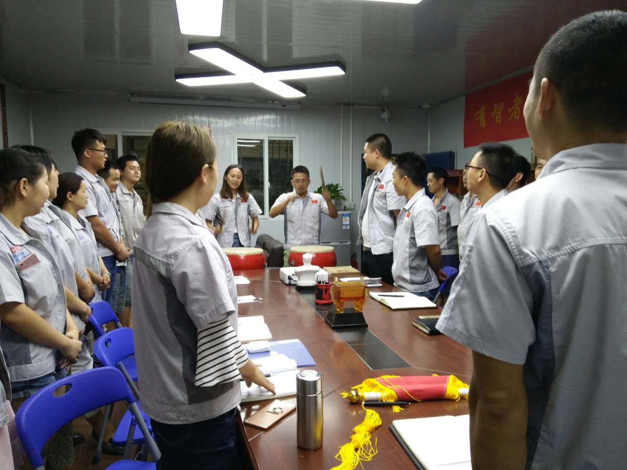 會議召開前,全體人員對企業三道“人道、孝道、商道”行三鞠躬,隨后以“士氣擊鼓”儀式正式進入會議主題。