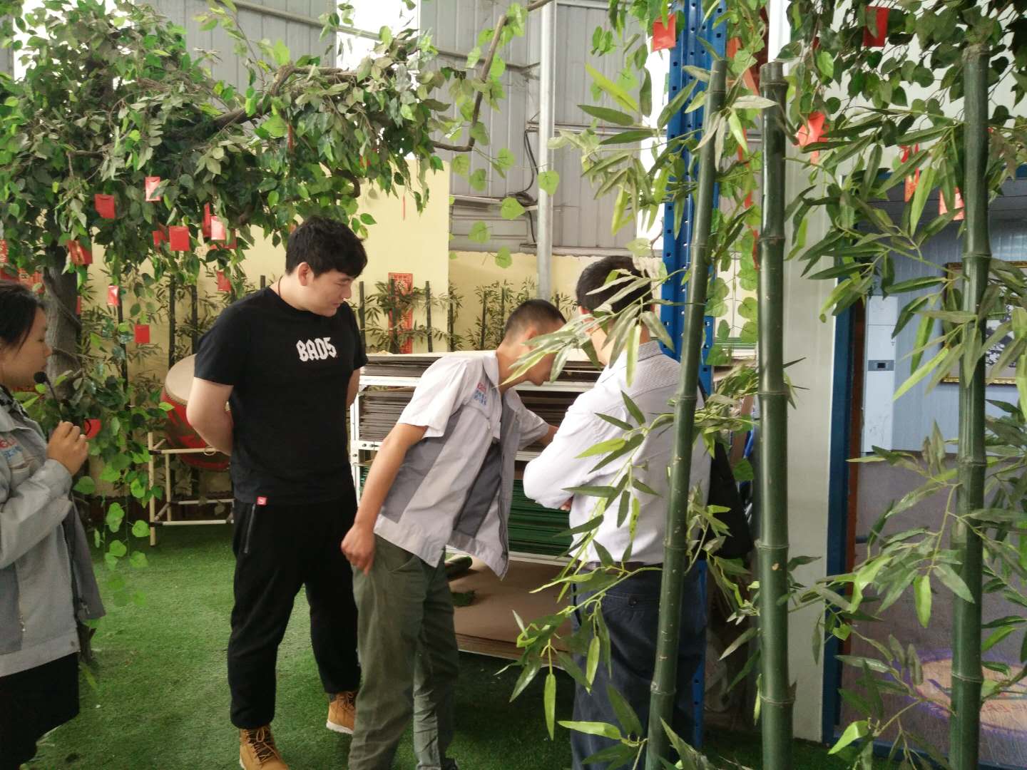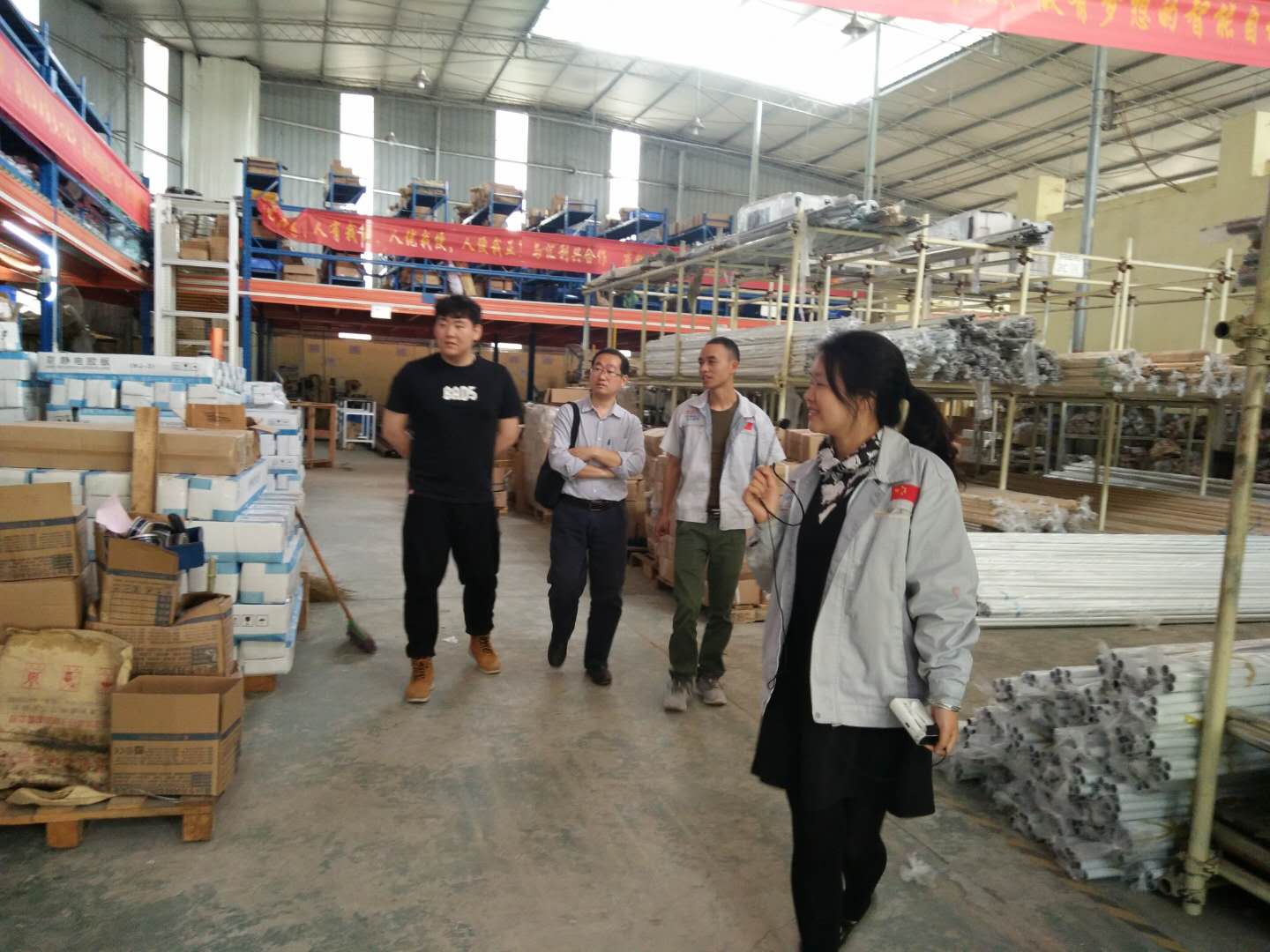 文化大使小敏為客人講解圖 匯利興家人為客人介紹產品圖 知之者不如好知者。賓客的初次拜訪,十分好奇我司企業文化和材料的種類,更想深入的了解及感受我司的文化氛圍。并由文化大使小敏一一進行解說及帶領參觀了型材庫區及加工區、滾筒生產、加工一體流程、全倉儲系統配件區,并引導客人參觀了我司匯興學校內的文化物件及材料樣品區,向客人解說了我司企業文化三道:人道、孝道、商道的寓意(人道:即是感恩自己,也是警醒自己;孝道:百善孝為先;商道:即是感恩我們的客戶),邀請了客人在“喜上眉梢、鴻運當頭”錦上添花、大紅大紫。 客人與匯利興家人合影留念 好之者不如樂之者。相談甚歡的客人們在深入了解我司企業文化及實力后,似有些相遇恨晚,隨即與我司人員探討合作事宜進一步增進彼此的友誼,攜手共進、友誼長存。