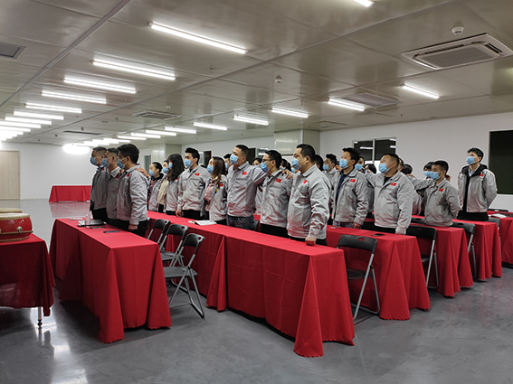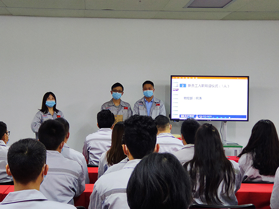 會議第一項議程,企業文化的展示。全體匯興人整肅衣冠對匯興人倍加推崇的“三道文化”(孝道、商道、人道)鄭重地鞠躬,莊嚴宣誓企業愿景:“成為全球領先的智能自動化產業鏈集成服務商”,企業使命:做受尊敬的好人,造受尊敬的產品,辦受尊敬的企業,建受尊敬的平臺,企業精神“用情做人、用心做事”,團隊精神“忠誠團結、勤奮進取”,工匠精神:創于手、精于工、智于器、匠于心、品于行等。隨后由胡總經理和張副總擊士氣鼓,士氣比武器更重要,現場氣氛熱烈、振奮人心。 會議第二項議程,新員工入職歡迎儀式。由常務副總徐總親自為新入職員工頒發紀念品。為公司注入新鮮血液,為團隊帶來新的生機和活力。