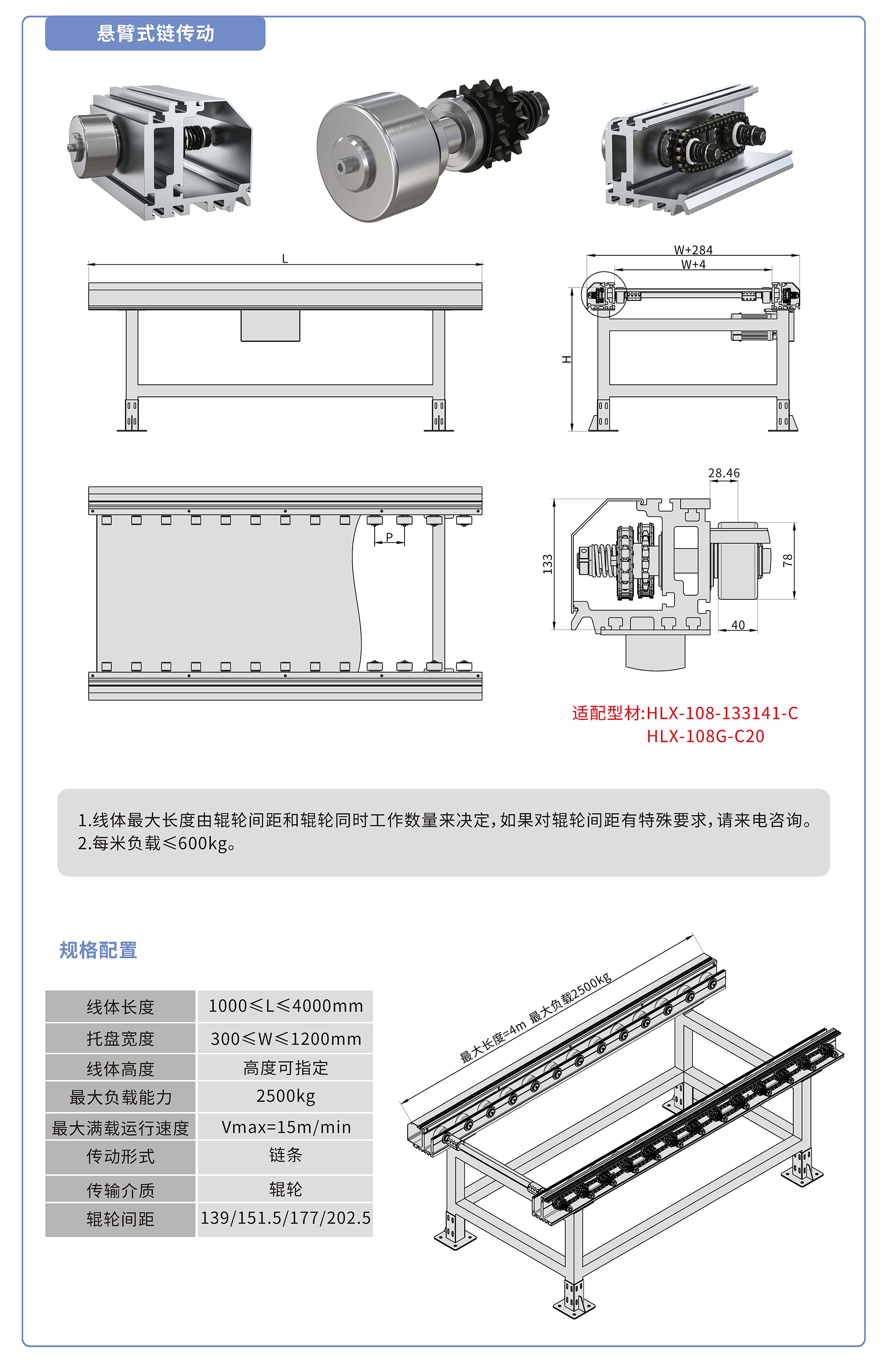 采用133141鋁型材,鏈輪傳動,鍍鉻滾輪鑲嵌銅套實現積放功能,負載2500kg/米,最大負載速度15M/min, 輪距139、151.5、177、202.5可選,適用托盤寬度300-1200mm,線體長度范圍1000-4000mm, 高度根據需求定制.